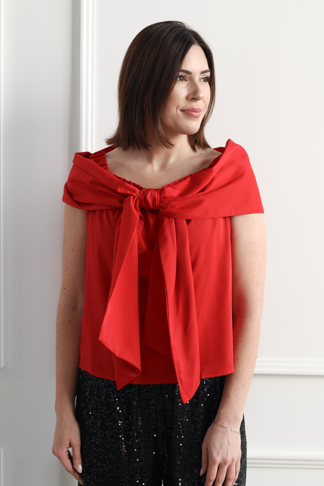 Elevate your holiday look with this charming off-the-shoulder blouse featuring an elegant ribbon bow detail. The classic red silhouette works beautifully for festive gatherings, offering a sophisticated yet playful touch.