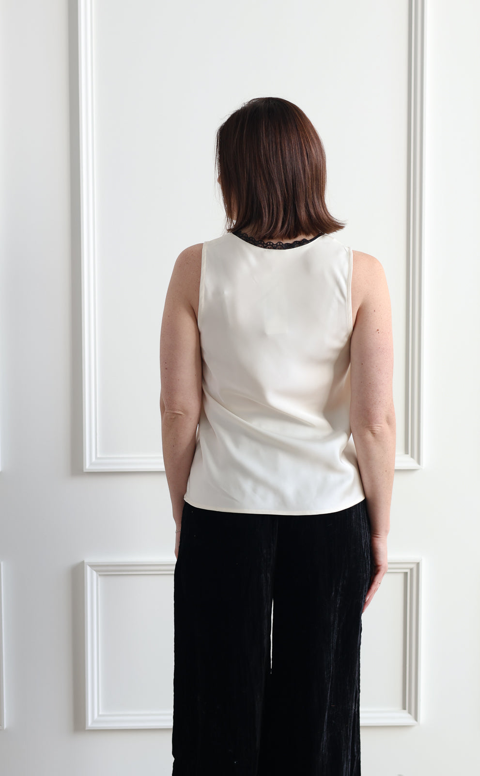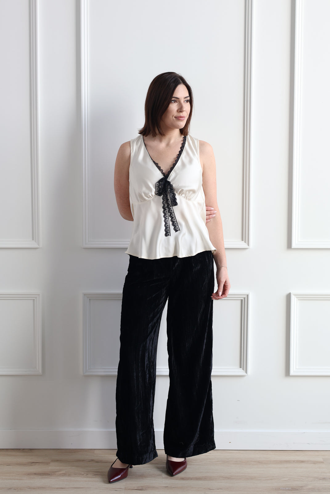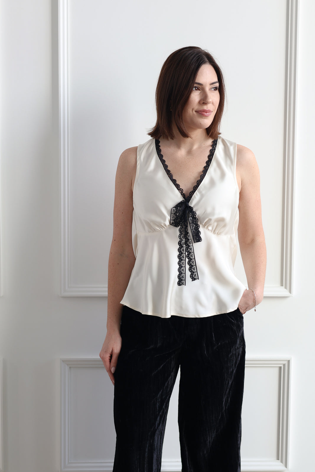 The Aurora Tank in Icing Sugar is your go-to piece for holiday gatherings and festive occasions. This elegant satin tank features delicate lace detailing that adds a touch of sophistication to any outfit.