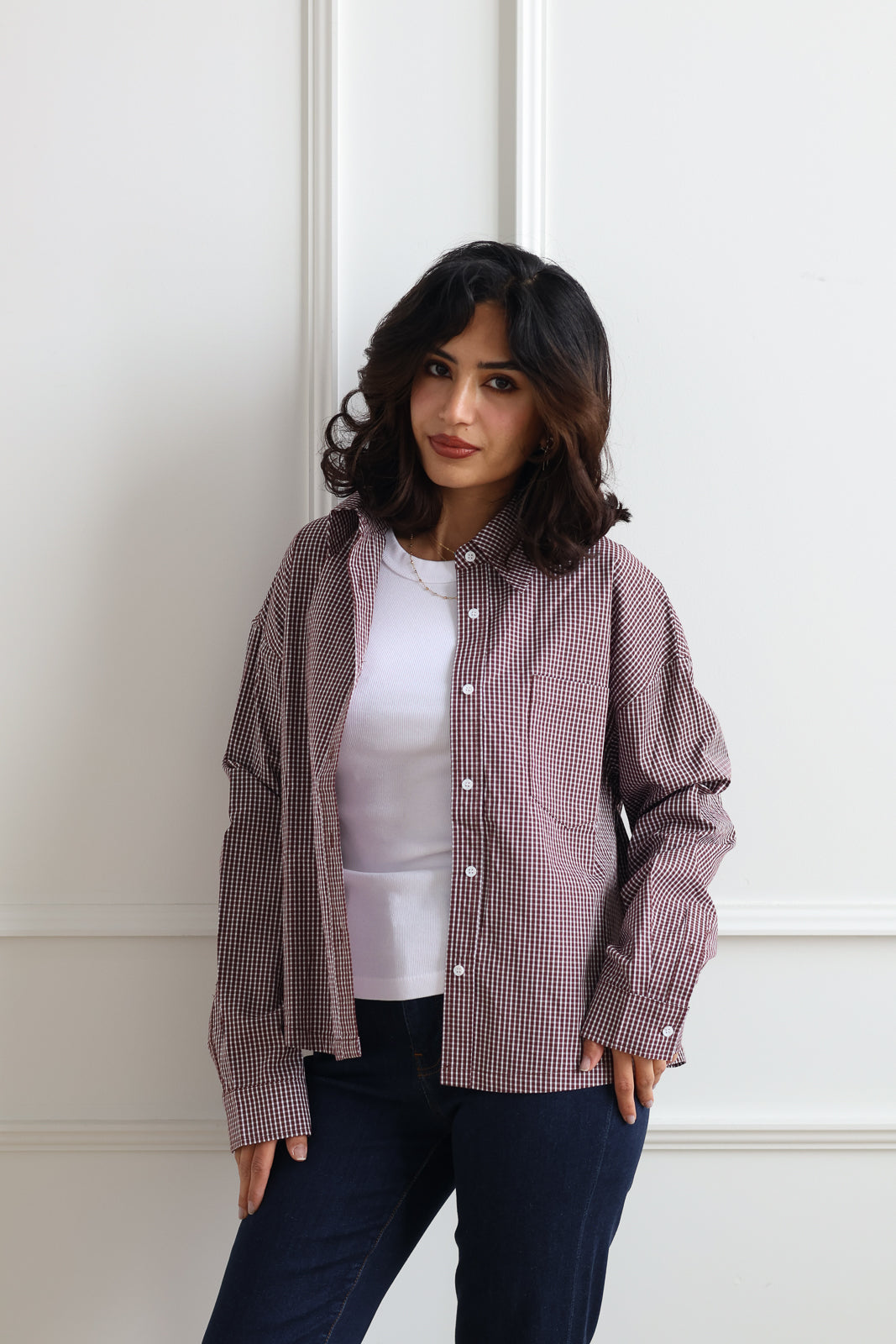 The Gates Button Down in brown gingham is an ideal layering piece for fall. Its shorter length makes it perfect for pairing with sweaters or jackets, adding warmth without bulk. Comfortable and stylish, it’s a versatile addition to your autumn wardrobe.