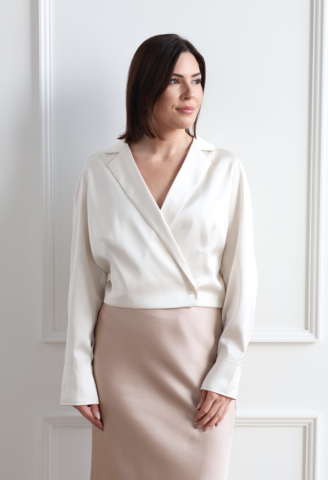 Elevate your wardrobe with this versatile cropped satin blazer blouse. The smooth, lustrous fabric drapes beautifully whether you're wearing it solo for a polished look or layering it over a dress for added dimension and style.