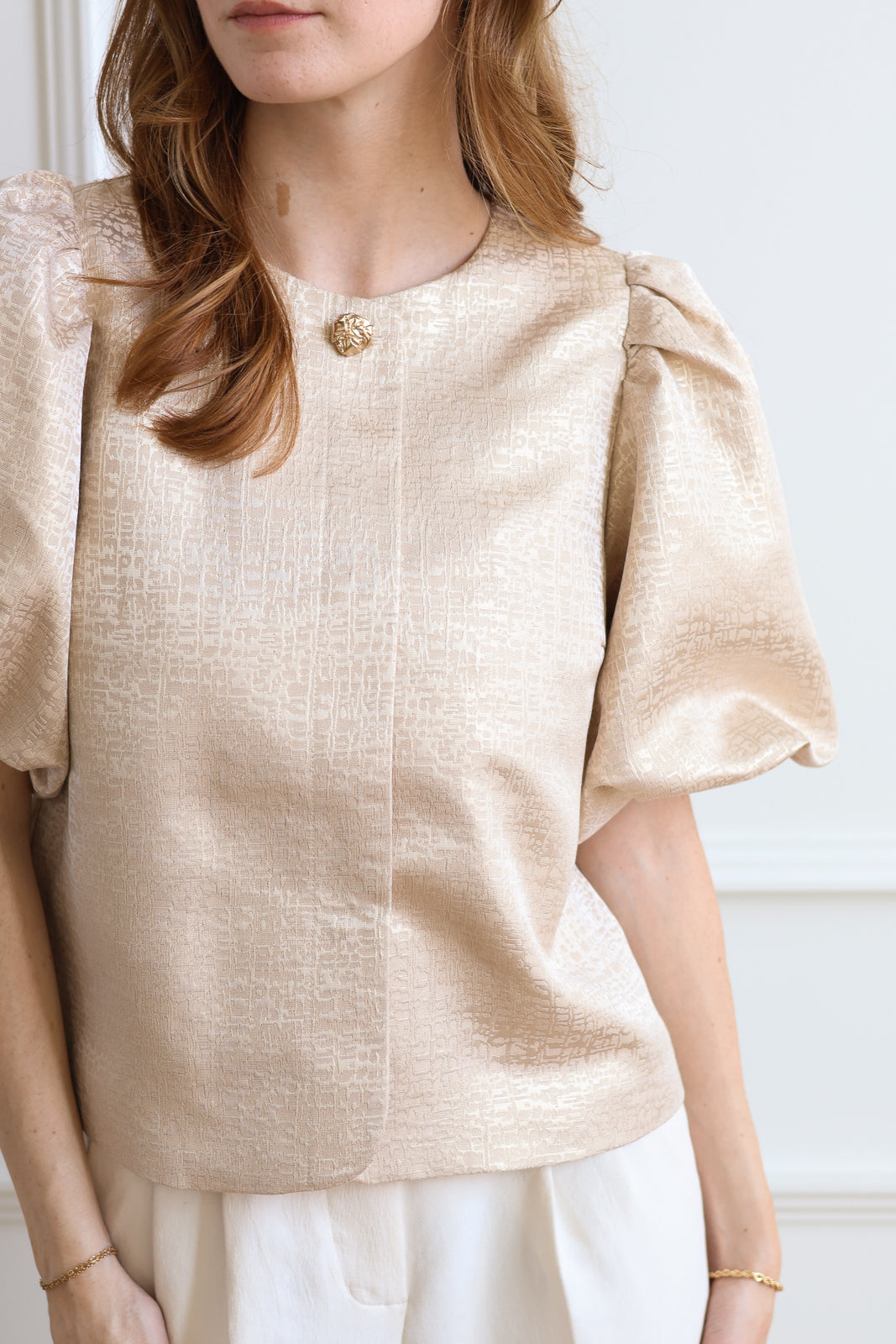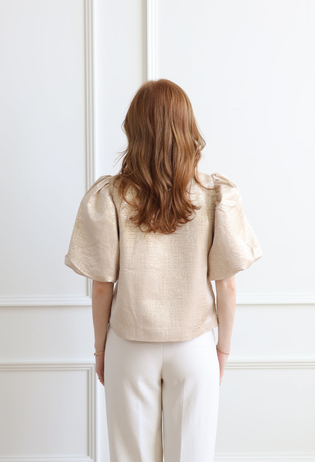 Elevate your holiday wardrobe with this textured gold blouse, featuring thoughtful button detailing that adds dimension and interest. The rich, warm tone pairs beautifully with denim for a casual-chic look or a slip skirt for something more polished and festive. Versatile enough for celebrations and special occasions, this piece brings effortless sophistication to your seasonal styling.