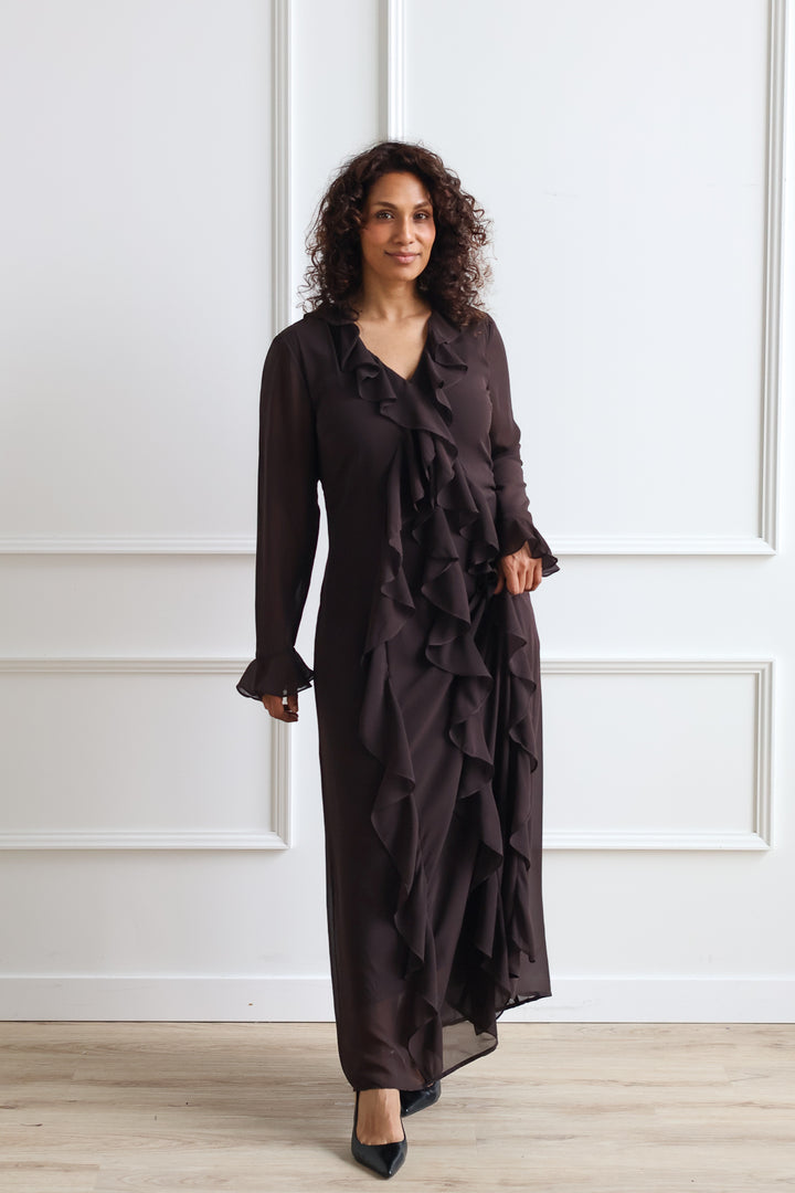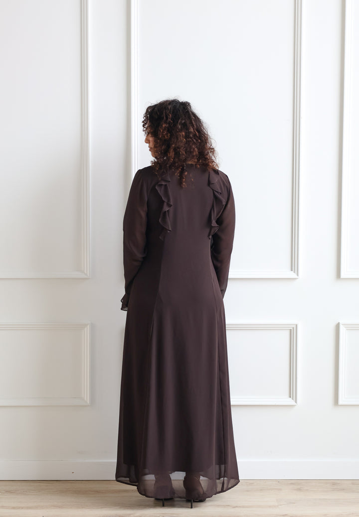 This Vero Moda Holly Flounce Maxi in a rich torte shade offers full-length sleeves and a captivating flounce design, perfect for fall wedding guests. Its maxi length and dark brown hue bring elegant warmth to cooler seasons, while the flowing silhouette ensures comfortable, graceful movement throughout your celebration.