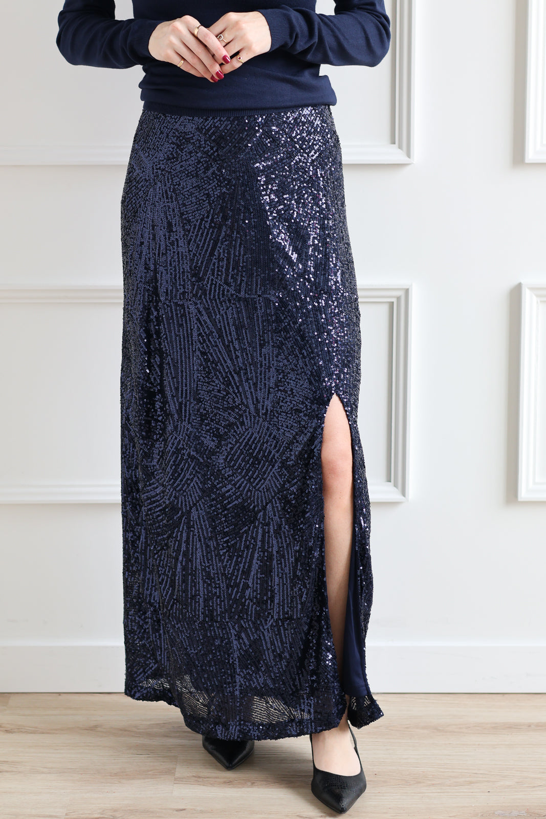 Elevate your style with ICHI's Navy Sequin Maxi Skirt. Featuring stunning sequins, this skirt can be worn with the matching top for a statement look or paired with a cozy knit for a chic and comfortable outfit.