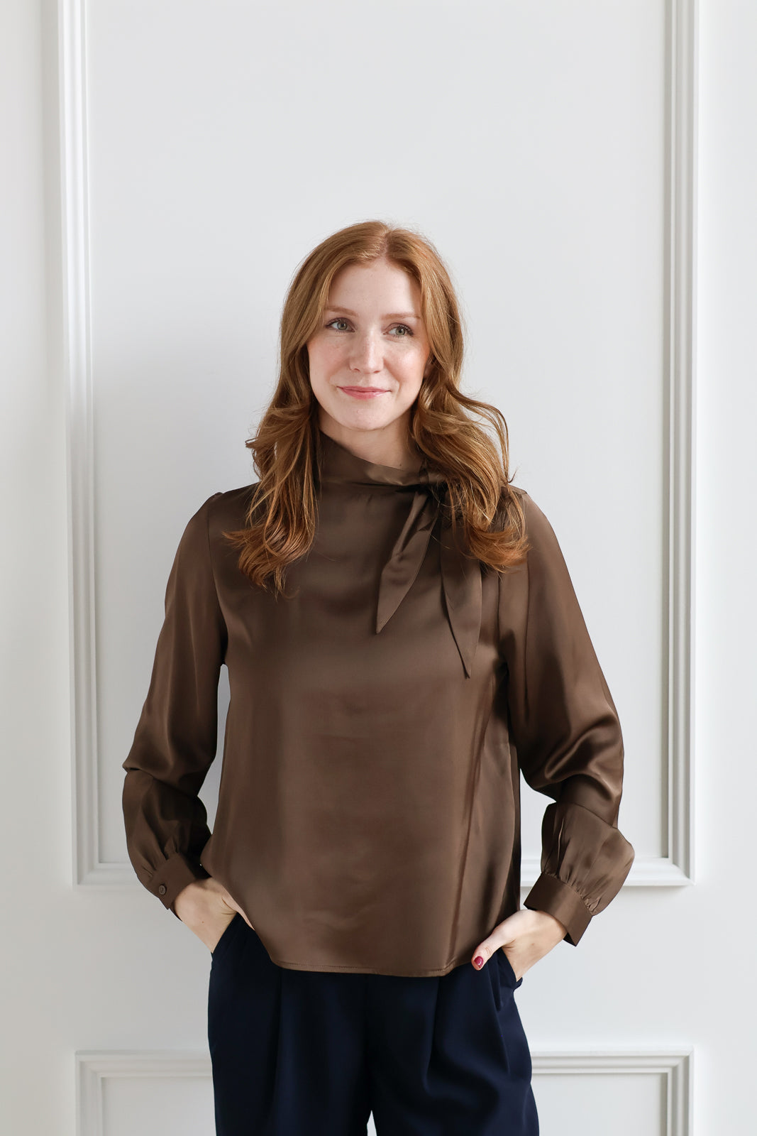 Elevate your wardrobe with this sophisticated bronze blouse, featuring a charming high neck bow detail that adds instant polish to any look. Layer it effortlessly under a blazer for refined workwear elegance, or wear it solo to bring a touch of chic flair to your next gathering.