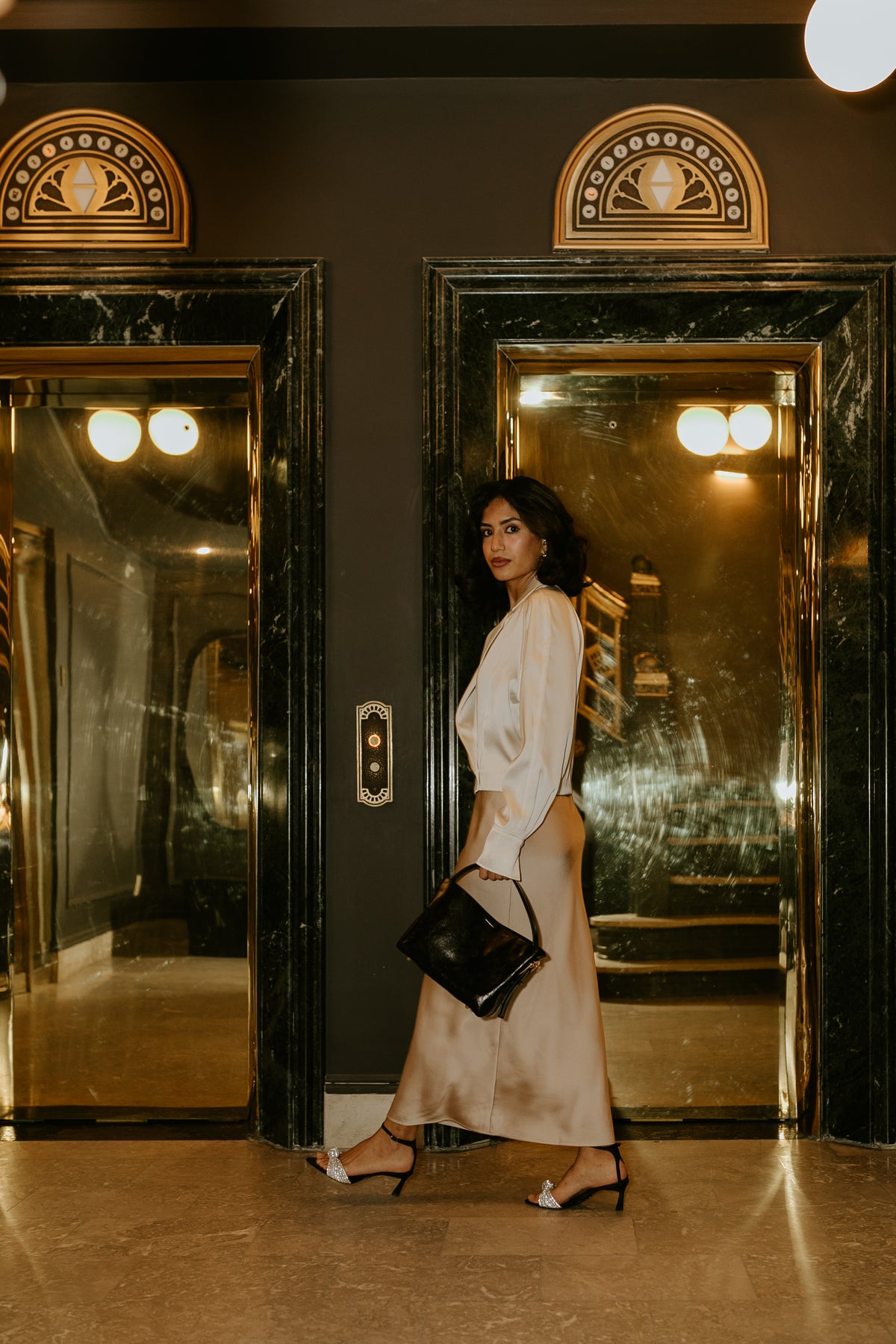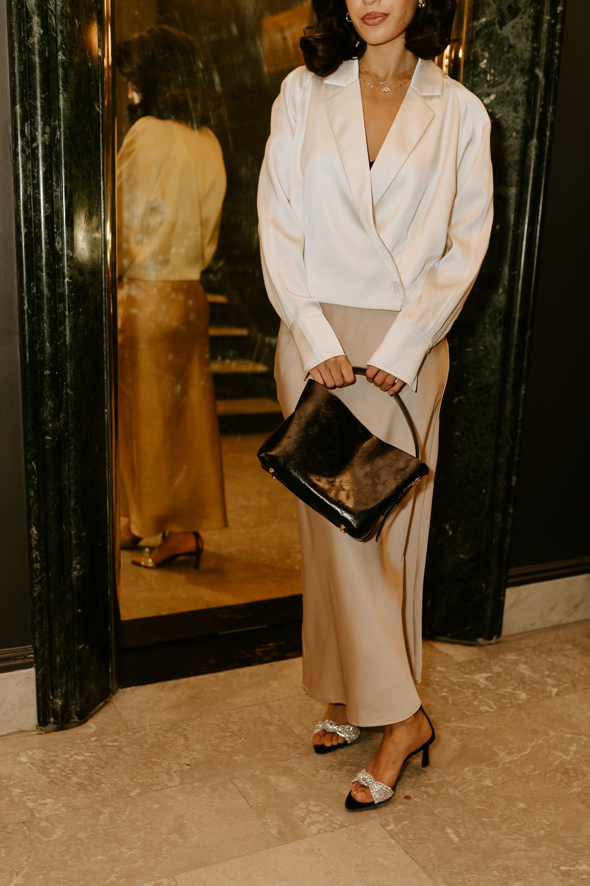 Elevate your wardrobe with this luxurious champagne satin slip skirt—a versatile essential that effortlessly transitions from day to night. The soft, neutral tone pairs beautifully with cozy knits for an understated, polished look.