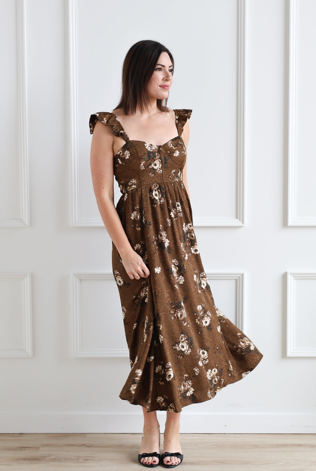 This bronze jacquard midi dress features delicate flutter sleeves and a corset-like bodice that flatters your silhouette. Its rich texture and warm tone make it an elegant choice for a fall wedding, combining comfort with timeless style to keep you looking effortlessly graceful throughout the celebration.