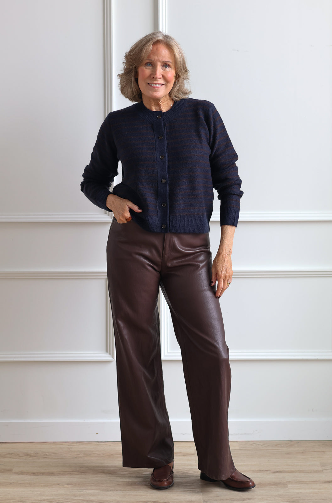These Alder Leather Trousers in Walnut offer a stylish alternative to denim with their pleather finish. Perfect for casual days, they pair effortlessly with a chunky knit for a cozy yet modern look. Comfortable and easy to wear, they bring a touch of edge to your everyday wardrobe while keeping you relaxed and confident.