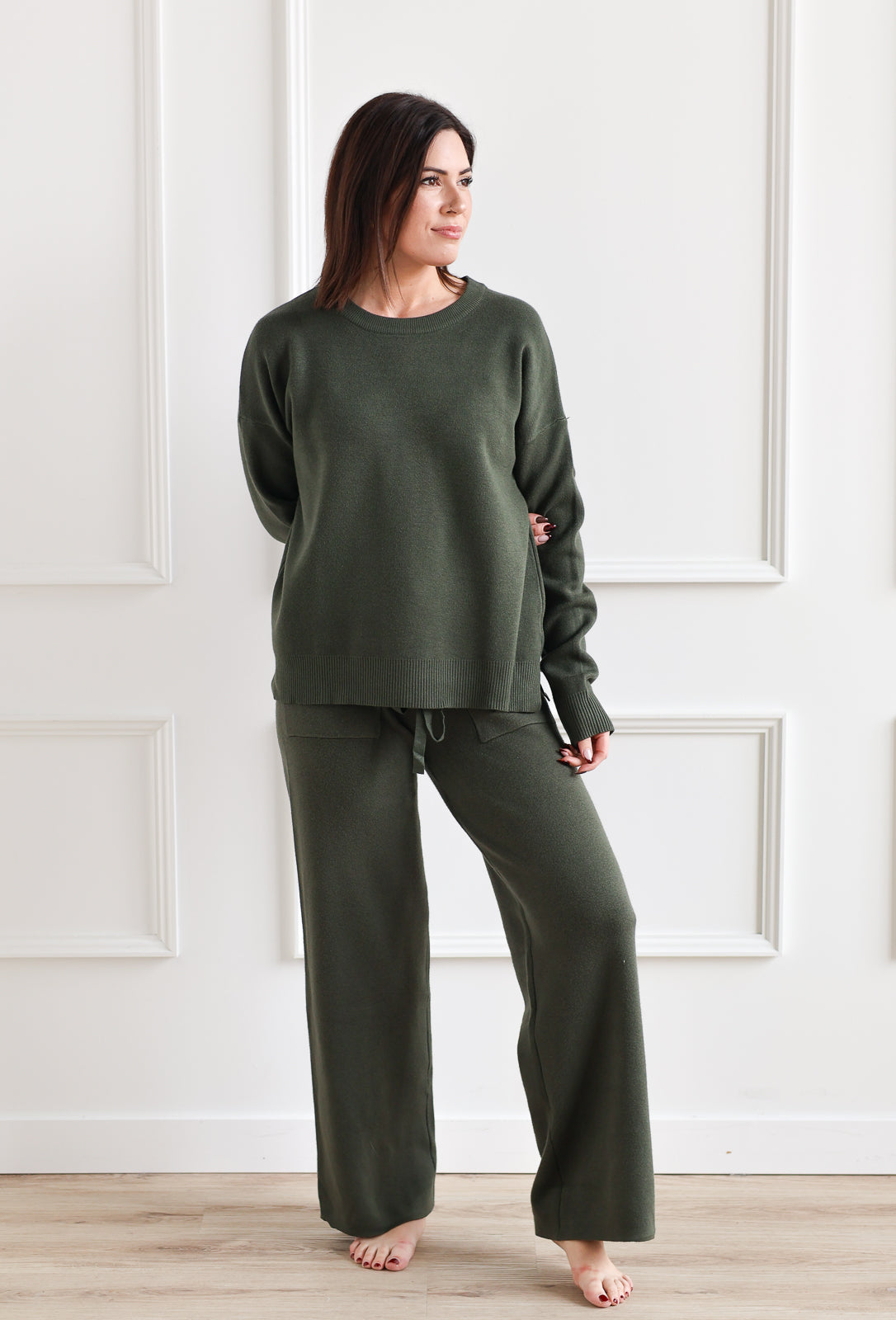 Stay cozy and stylish this winter with our Soft Crew Knit in Hunter Green. The matching knit pant completes the look for a chic and comfortable outfit. Keep warm without sacrificing style.