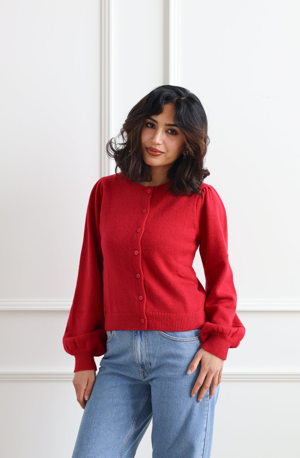 Embrace effortless elegance with the Sola Cardigan, a charming red knit designed to brighten your cooler-weather wardrobe. Featuring delicate puff sleeves that add a touch of feminine flair, this piece brings warmth and personality to layered looks.