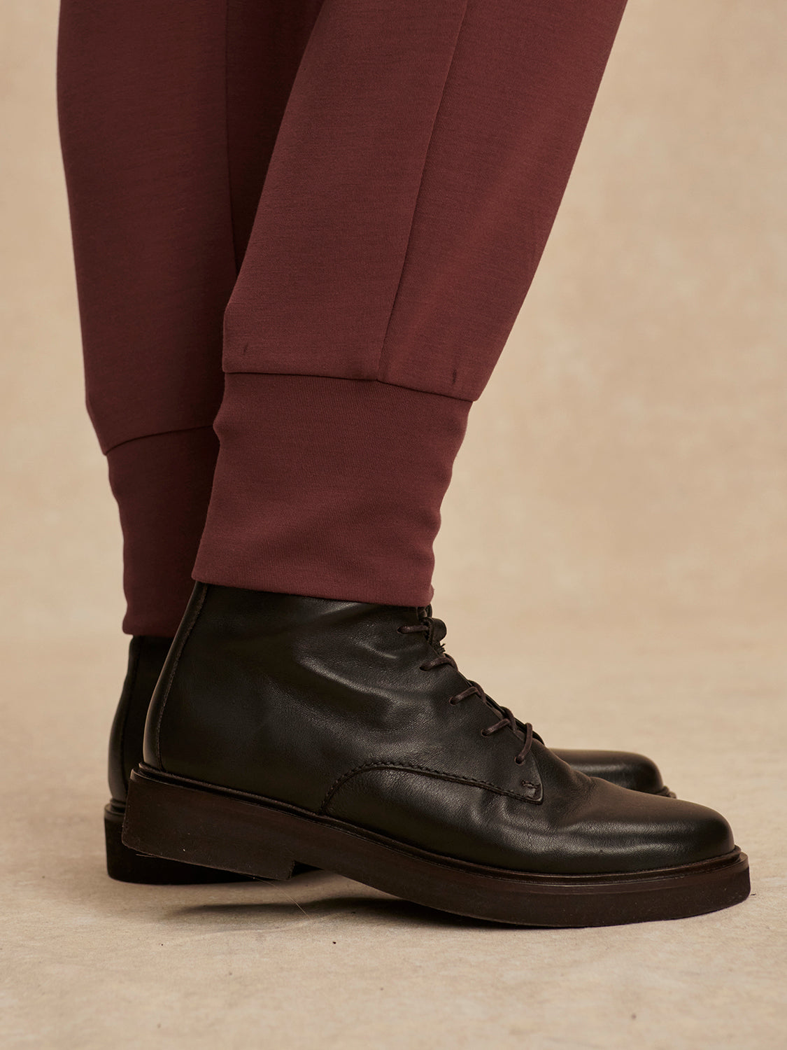 These pants boast a slim, tailored fit that flatters your figure and a cuffed hem that adds a touch of sophistication. The elasticated waistband and internal drawcord provide a personalized fit, while the side and back pockets offer practicality. Perfect for pairing with our DoubleSoft sweaters, they are the ultimate combination of comfort and elegance.