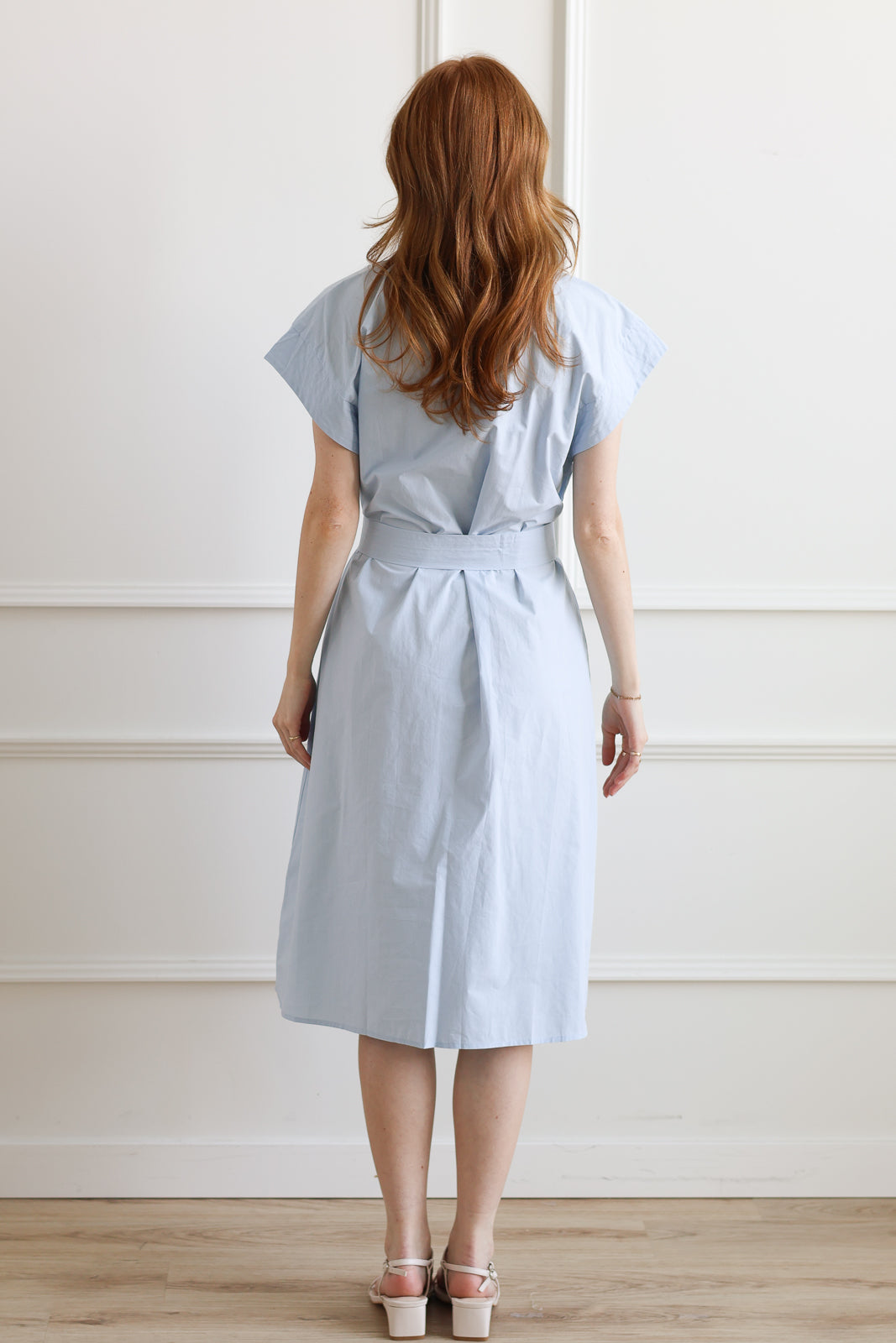 Elevate your spring wardrobe with this pale blue cotton dress, designed for effortless elegance. The integrated belt detail cinches at the waist to create a flattering silhouette. Crafted from breathable cotton, it's the ideal choice for warm-weather styling—whether you're dressing up for an occasion or keeping it casual.
